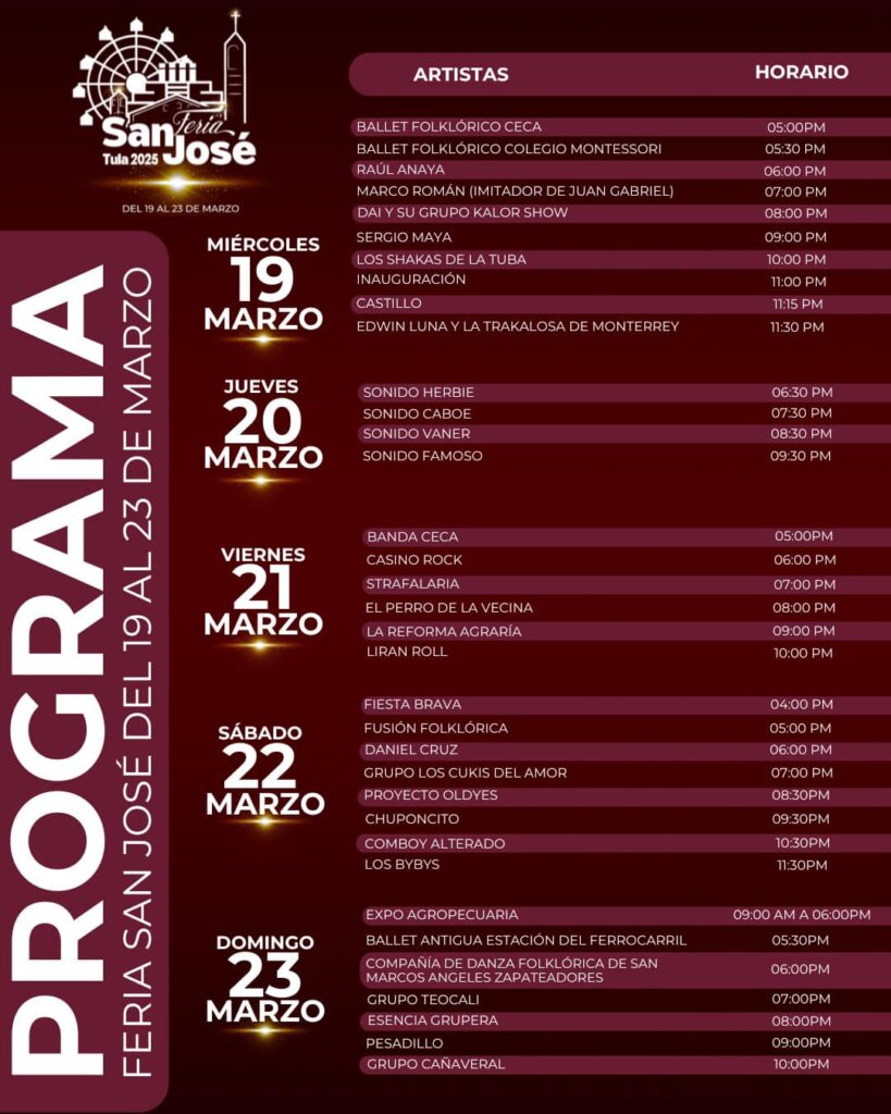 La Feria San José Tula 2025 está lista para ofrecer cinco días de entretenimiento con un programa variado de música, danza y cultura.