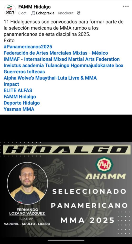 “Es mi primera vez como seleccionado nacional. Me dieron la noticia, a través del presidente de la Asociación Hidalguense de Artes Marciales Mixtas, Yasman Adrian Pichardo. Estoy muy agradecido con él, con la Academia Alpha Wolves, y mi entrenador Carlos Paita Camargo”, comenta emocionado.