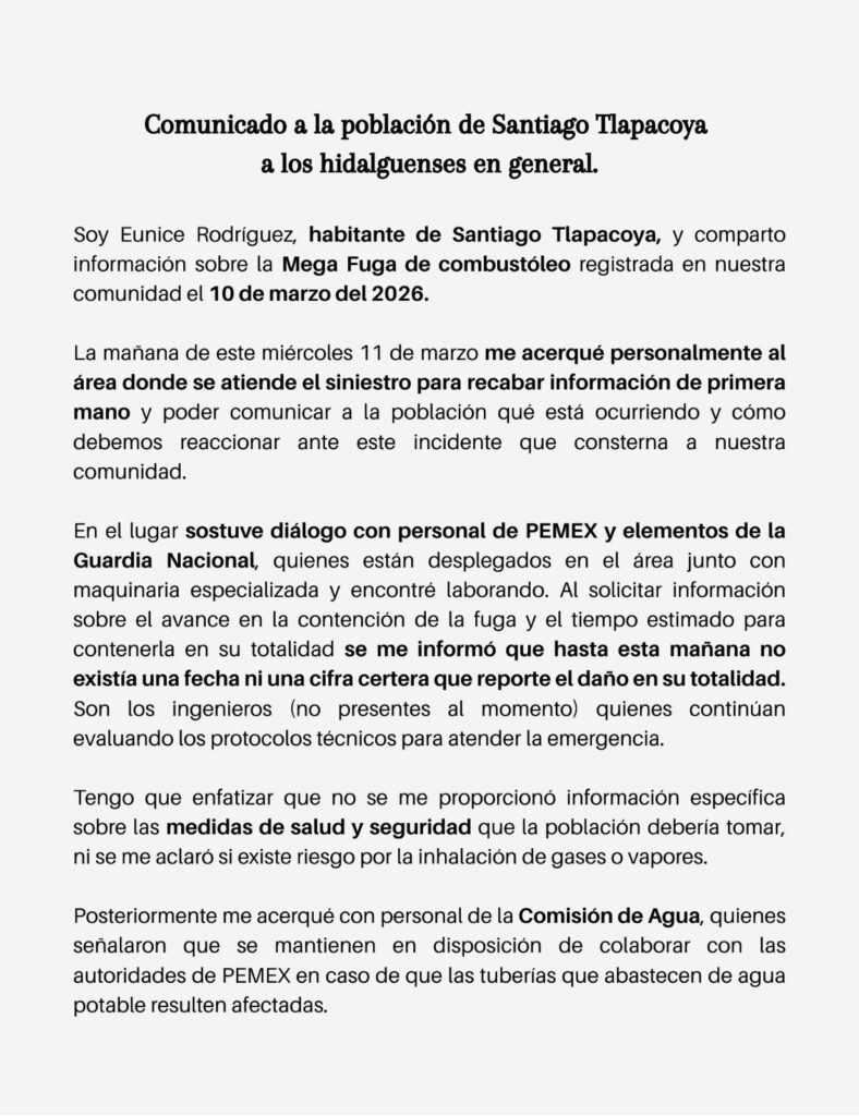 Tras la fuga de combustible registrada el 10 de marzo de 2026 en la comunidad de Santiago Tlapacoya, en Pachuca, una habitante de la zona difundió un comunicado dirigido a la población local y a los hidalguenses para compartir información sobre lo que observó en el área del incidente.