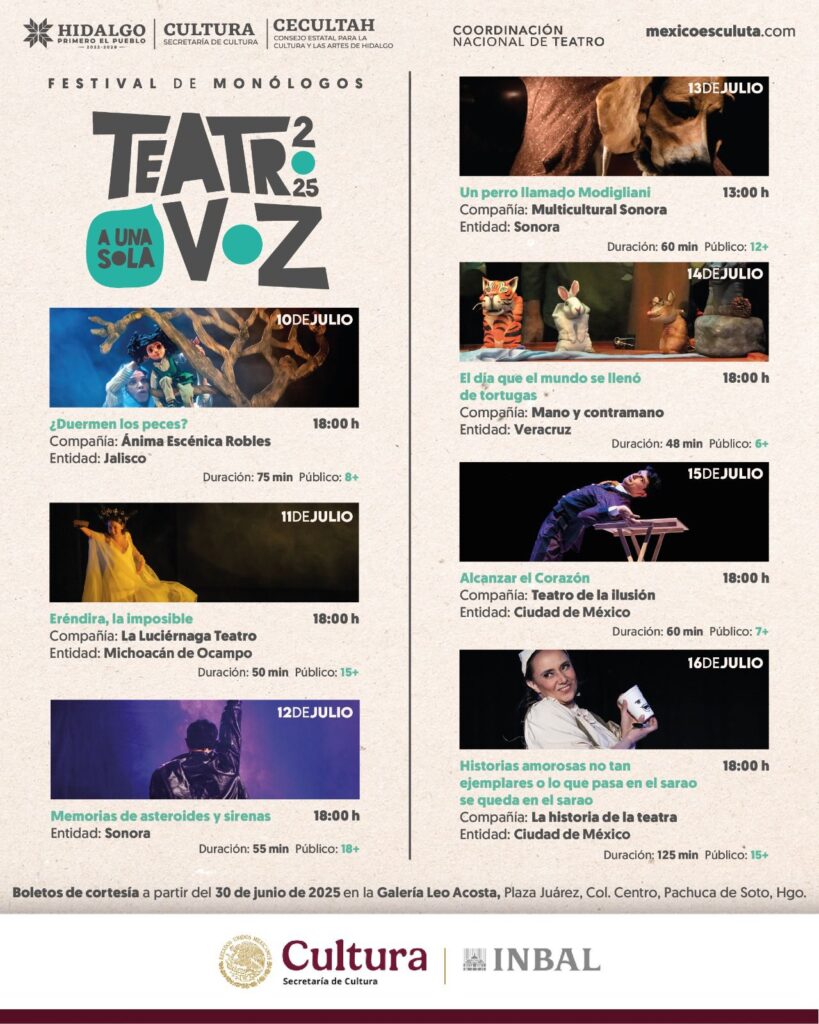 Por primera vez, Hidalgo será sede del Festival de Monólogos “Teatro a Una Sola Voz”, uno de los circuitos escénicos más representativos del país, que este año celebra su vigésima edición con funciones gratuitas en el Teatro Guillermo Romo de Vivar, del 10 al 16 de julio.