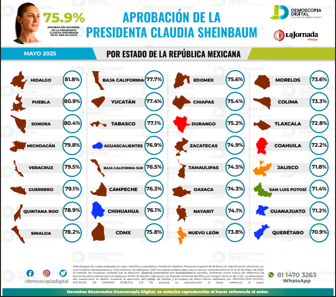 Entre los 32 estados del país, Hidalgo ocupa el primer lugar en aprobación ciudadana hacia Sheinbaum, seguido de Puebla (80.9%) y Sonora (80.4%). Otros estados con altos niveles de respaldo son Michoacán, Veracruz y Guerrero.