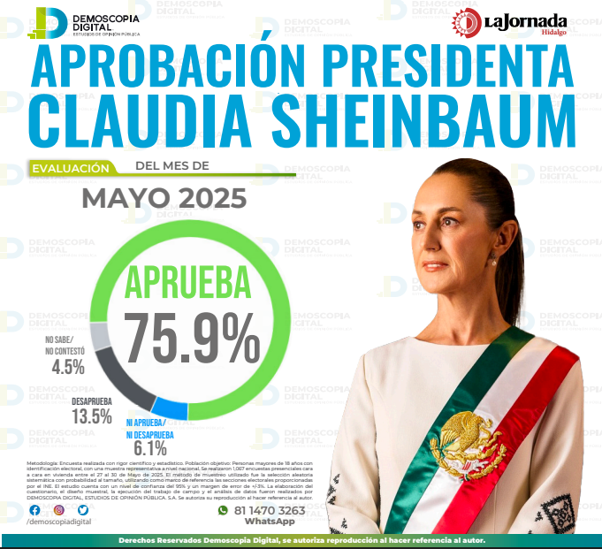 De acuerdo con los resultados de la evaluación mensual de la casa encuestadora Demoscopia Digital, correspondientes a mayo de 2025, la presidenta Claudia Sheinbaum cuenta con una aprobación del 81.8% entre la población de Hidalgo, posicionándose como uno de los estados con mayor respaldo a su gestión.