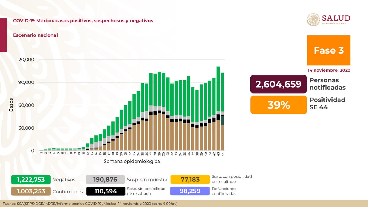 En esta semana 44, México sobrepasó el millón de personas contagiadas. Según datos de la Secretaría de Salud federal, suman ya un millón 3 mil 253 personas contagiadas, en tanto, suma 98 mil 259 personas fallecidas.