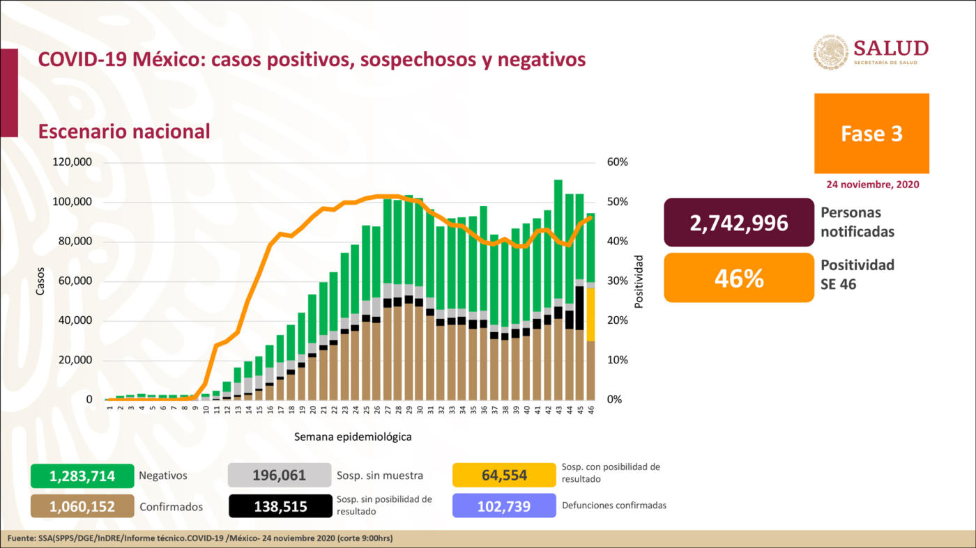 Al 24 de noviembre de 2020 a nivel nacional hay un millón 60 mil 152 casos confirmados de Covid 19, con 791 mil 516 personas recuperadas.