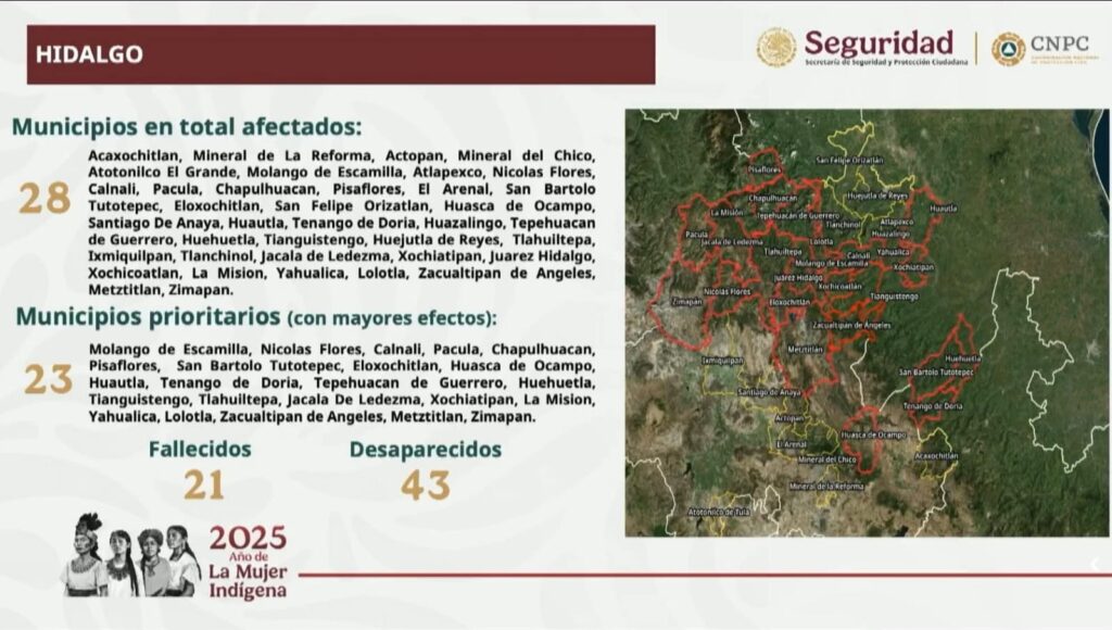 Aunque el fin de semana pasada trascendió que en Hidalgo sumaban 22 personas sin vida, tras las lluvias intensas por el huracán Priscila, este lunes en la conferencia de prensa matutina de la presidenta Claudia Sheinbaum Pardo, el gobernador del estado, Julio Menchaca informó que suman 21 fallecidos, así como 43 no localizados.