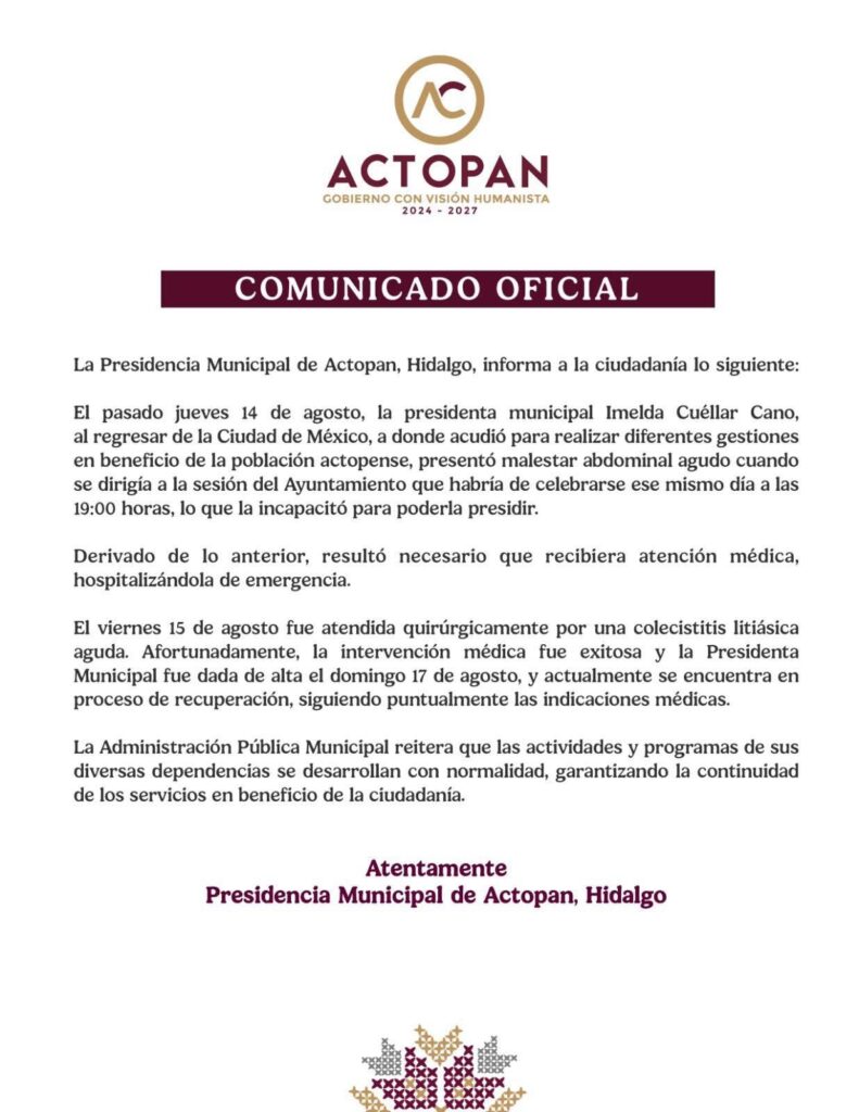 La Presidencia Municipal de Actopan informó que la alcaldesa Imelda Cuéllar Cano presentó un cuadro de malestar abdominal agudo el pasado jueves 14 de agosto, mientras se dirigía a la sesión del Ayuntamiento programada para esa noche.