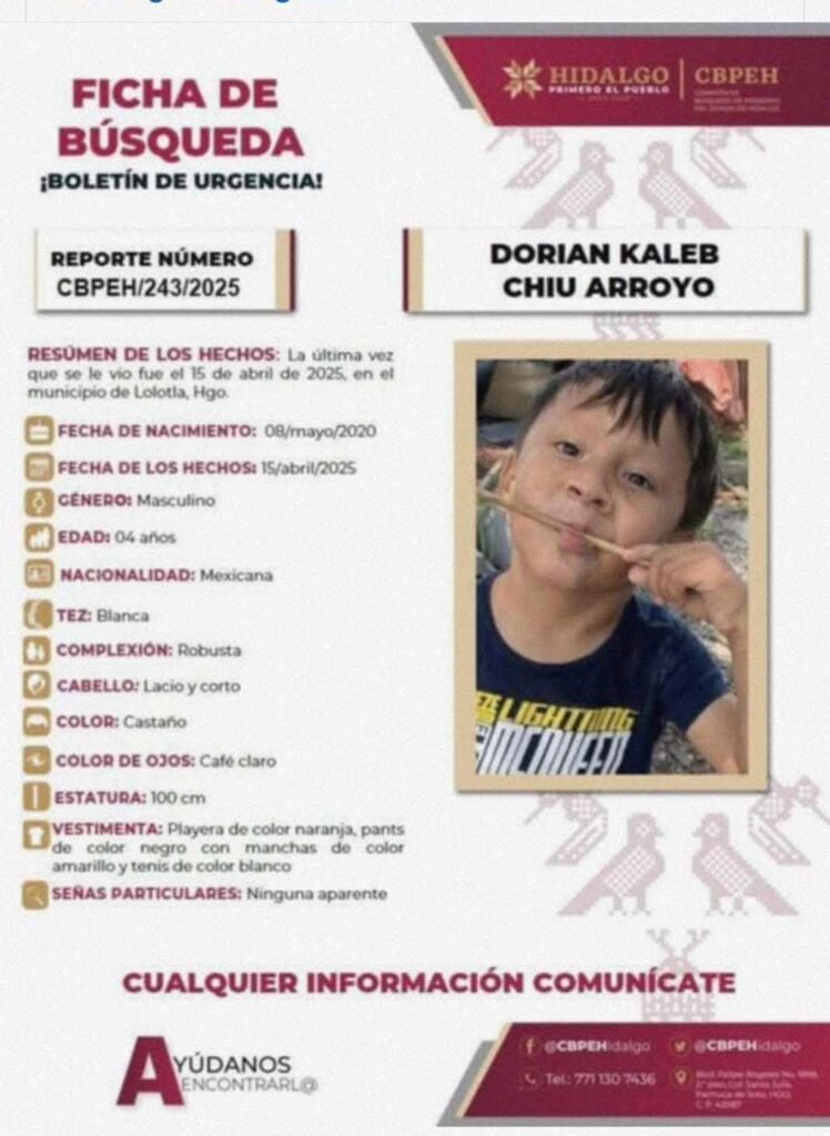 Continúa la búsqueda del menor Dorian Kaleb, quien desapareció el pasado 15 de abril en la comunidad de Huitznopala, Lolotla, en un trabajo coordinado entre la Comisión de Búsqueda de Personas del Estado de Hidalgo, Guardia Nacional, Policía Estatal, Agencia de Investigación Criminal, Fiscalía Especializada en Personas Desaparecidas, binomios caninos y hasta pobladores.