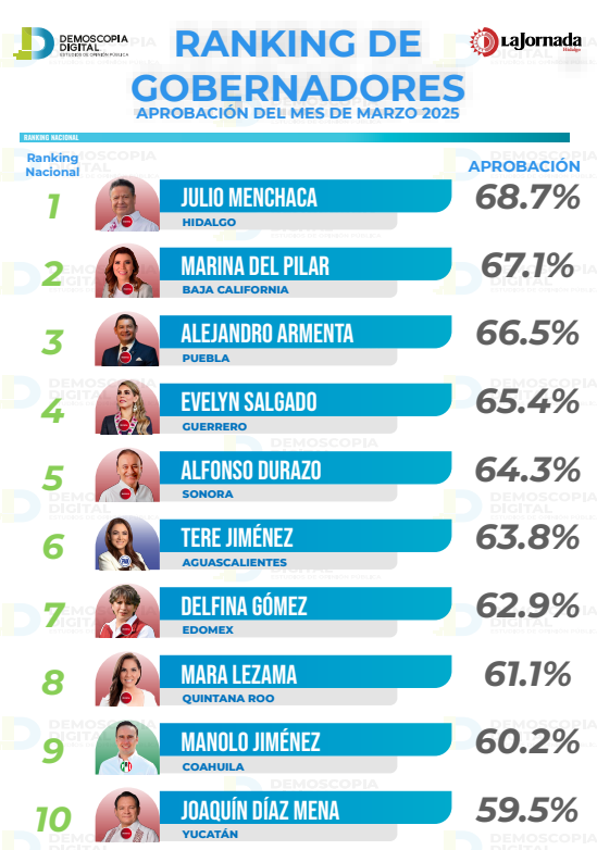 Después de Julio Menchaca, que tiene un 68.7% de aprobación, sigue la gobernadora Marina del Pilar de Baja California, con un 67.1%. Alejandro Armenta de Puebla se ubica en el tercer lugar con un 66.5%.