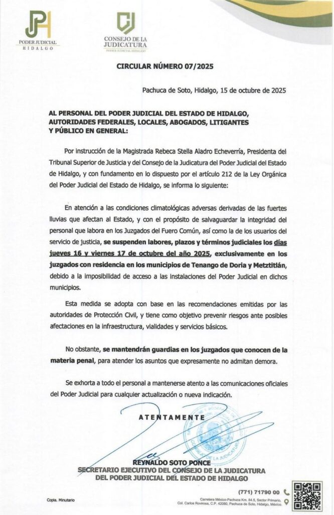 El Poder Judicial del Estado de Hidalgo informó la suspensión de labores, plazos y términos judiciales los días jueves 16 y viernes 17 de octubre de 2025 en los juzgados con residencia en los municipios de Tenango de Doria y Metztitlán, debido a las condiciones climatológicas adversas provocadas por las fuertes lluvias en la región.