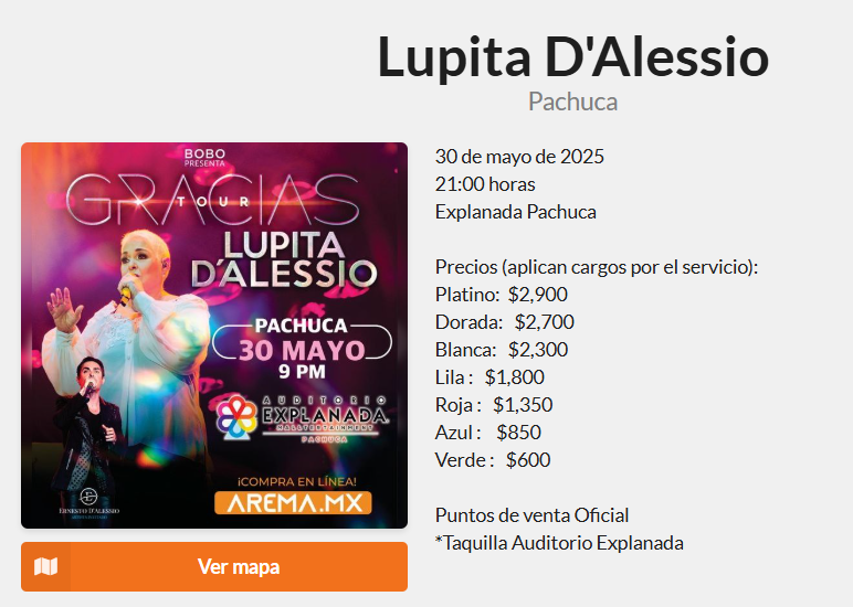 Los boletos ya están disponibles en taquillas del Auditorio Explanada y en la plataforma Arema Ticket. Precios por zona (más cargos por servicio):