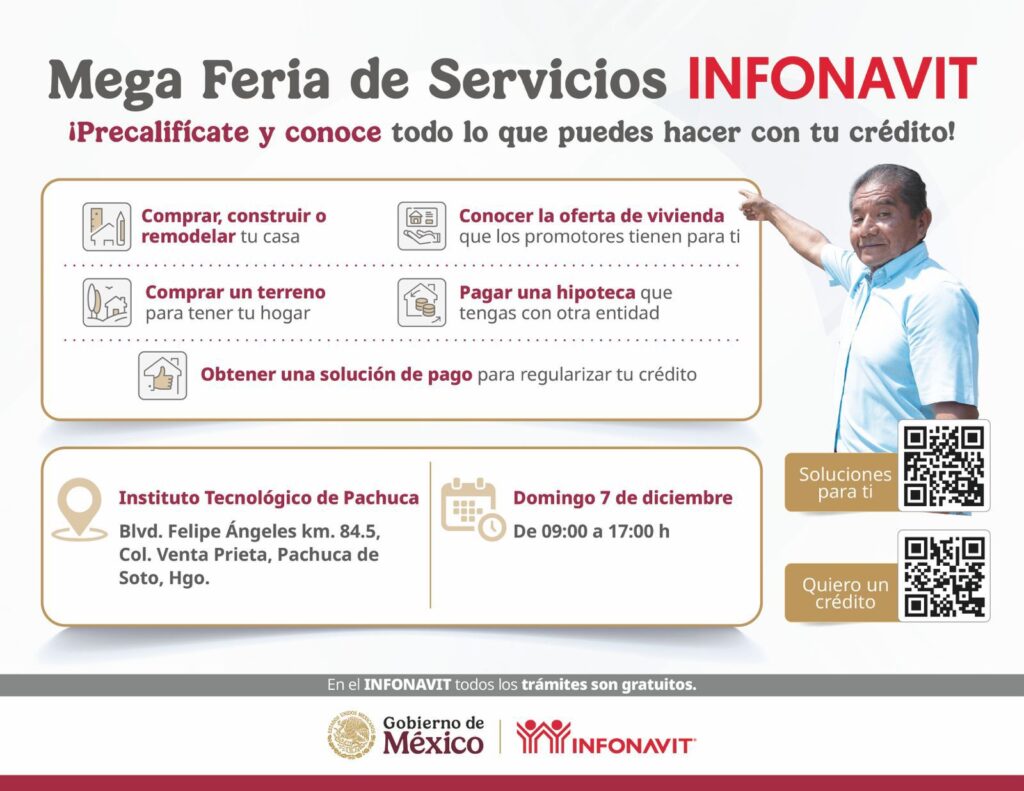 El Instituto del Fondo Nacional de la Vivienda para los Trabajadores (INFONAVIT) llevará a cabo su última Mega Feria de Servicios del año en Pachuca, con el propósito de acercar sus opciones crediticias y diversos servicios a las y los trabajadores derechohabientes.