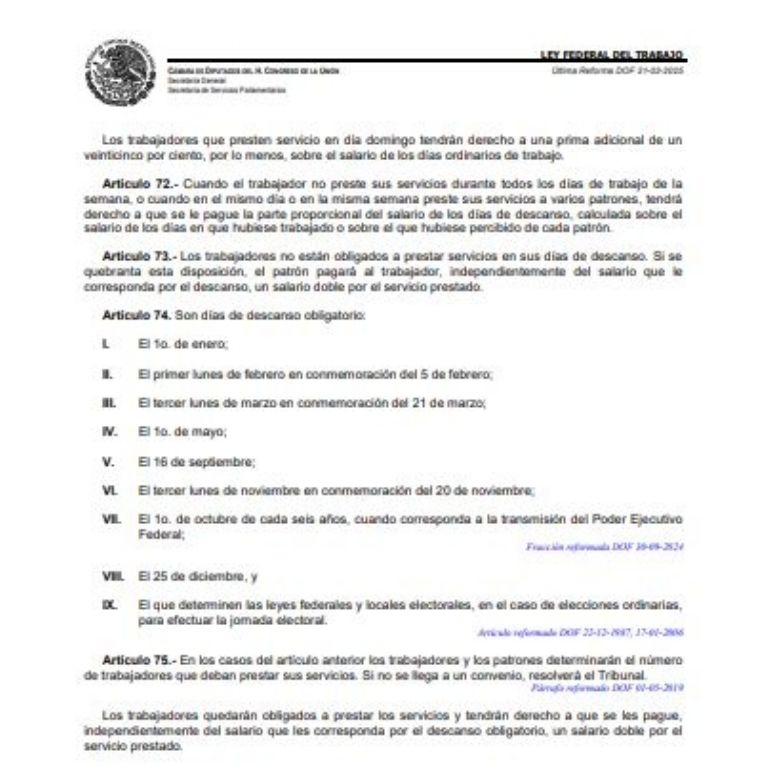 Para las personas trabajadoras que deban laborar el lunes 2 de febrero, la ley es muy clara. El artículo 75 de la Ley Federal del Trabajo establece que quienes presten sus servicios en un día de descanso obligatorio tienen derecho a un pago especial.