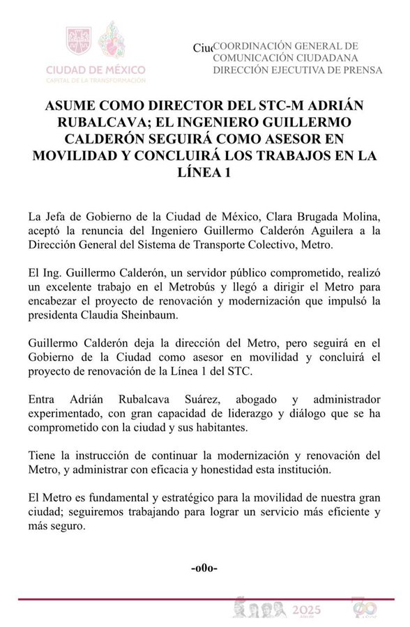 A través de un comunicado, el Gobierno de la Ciudad de México informó que la jefa de Gobierno de la CDMX, Clara Brugada aceptó la renuncia del Ingeniero Guillermo Calderón.