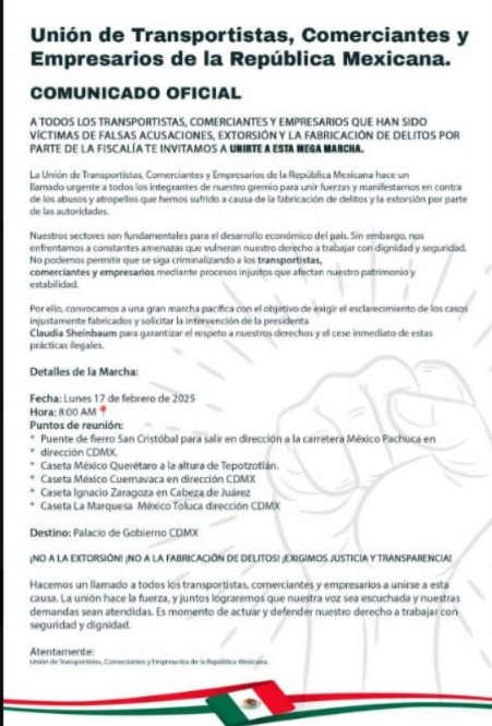La Unión de Transportistas, Comerciantes y Empresarios de la República Mexicana ha realizado un llamado urgente a todos sus integrantes para participar en una megamarcha contra las extorsiones y la fabricación de delitos por parte de la Fiscalía.