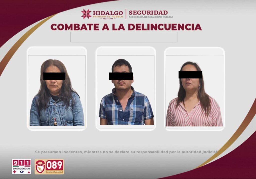 Gracias a las cámaras del C5i, el vehículo fue localizado en la colonia Taxhuada, donde fue intervenido por agentes de la SSPH. Dentro de la unidad viajaban M. E. F. M., D. A. C. L. y M. P. S., quienes fueron detenidos y puestos a disposición del Ministerio Público para continuar con las investigaciones.