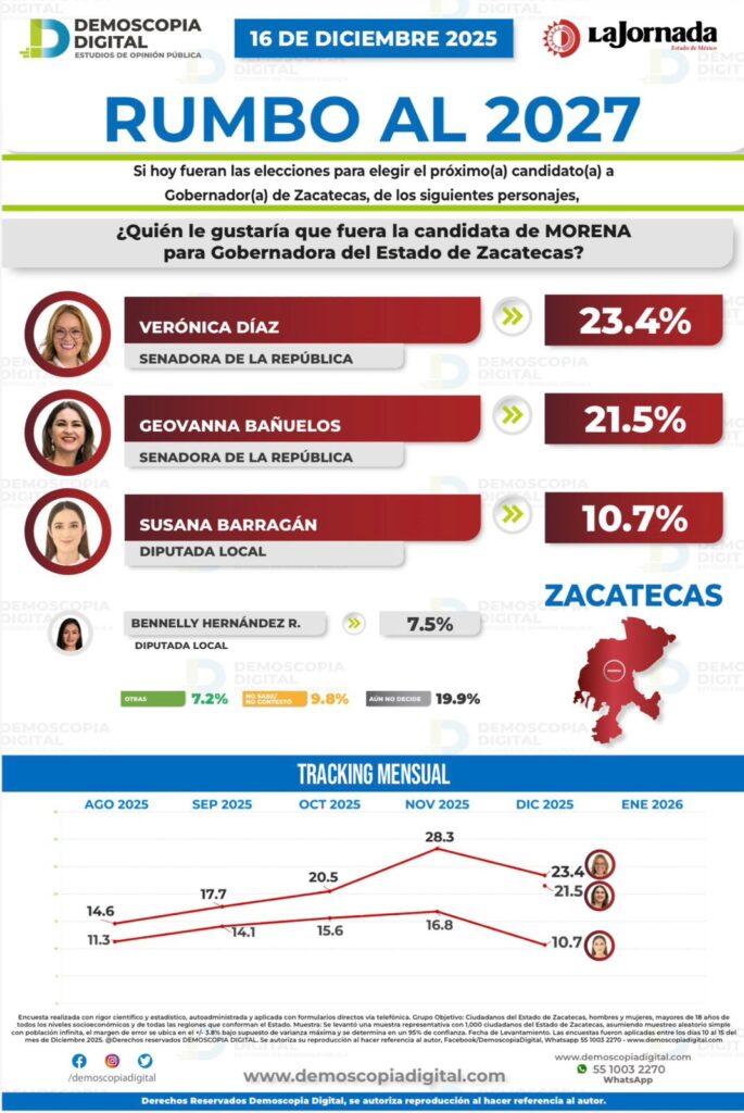 Los resultados de Demoscopia Digital, coincidentes con otras mediciones independientes publicadas en distintos momentos, refuerzan la lectura de una tendencia sostenida que posiciona a Morena y a Ulises Mejía Haro como las opciones con mayor viabilidad electoral rumbo a 2027 en Zacatecas.
