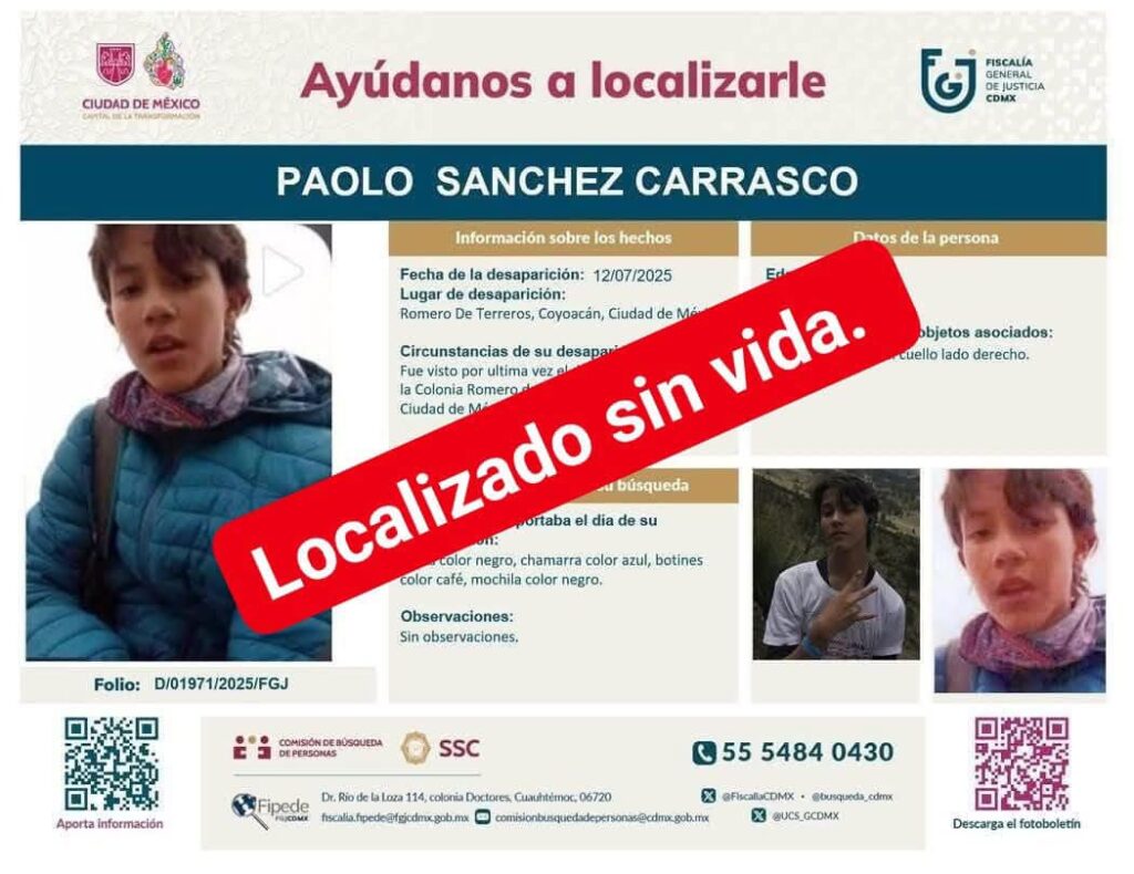 El pasado sábado, autoridades de la CDMX, emitieron un reporte de búsqueda de Paolo a quien la última vez que se le vio fue en la colonia Romero de Terreros.