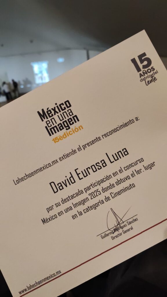 El fotógrafo hidalguense David Eurosa Luna, obtuvo por segunda ocasión el primer lugar en la categoría de Cineminuto del concurso nacional México en una Imagen, uno de los certámenes más importantes de fotografía y narrativa visual del país, en sus ediciones 2023 y 2025, consolidándose como una de las voces emergentes más relevantes en el cine documental independiente.