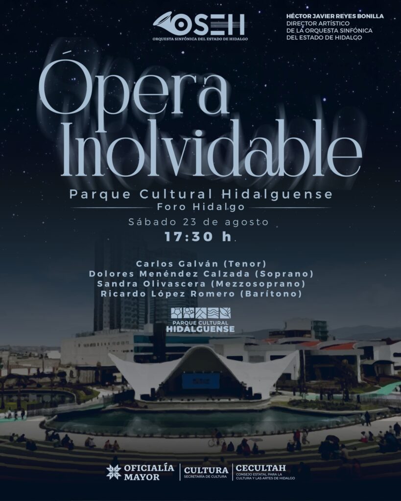 Si estás pensando qué hacer este fin de semana en Hidalgo y te gustan los eventos en vivo, la Orquesta Sinfónica del Estado de Hidalgo presentará una función especial titulada Ópera Inolvidable, en la que el público podrá disfrutar de piezas icónicas de la música clásica en el Parque Cultural Hidalguense.