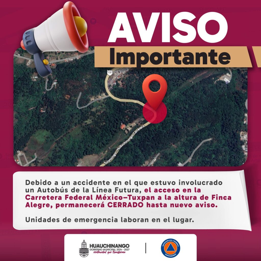 La mañana de este sábado se registró un accidente en la carretera México-Tuxpan, en la zona conocida como Los Pinos, a la altura de Huauchinango, Puebla, cuando un autobús de la línea Futura cayó a un barranco de más de 15 metros.