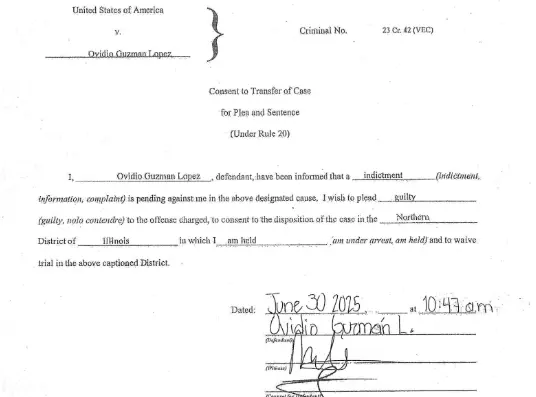El documento confirmó que Ovidio Guzmán, conocido también como “el ratón”, accedió a declararse culpable para evitar un juicio en Nueva York y recibir sentencia en el distrito norte de Illinois, donde se encuentra detenido desde septiembre del 2023.