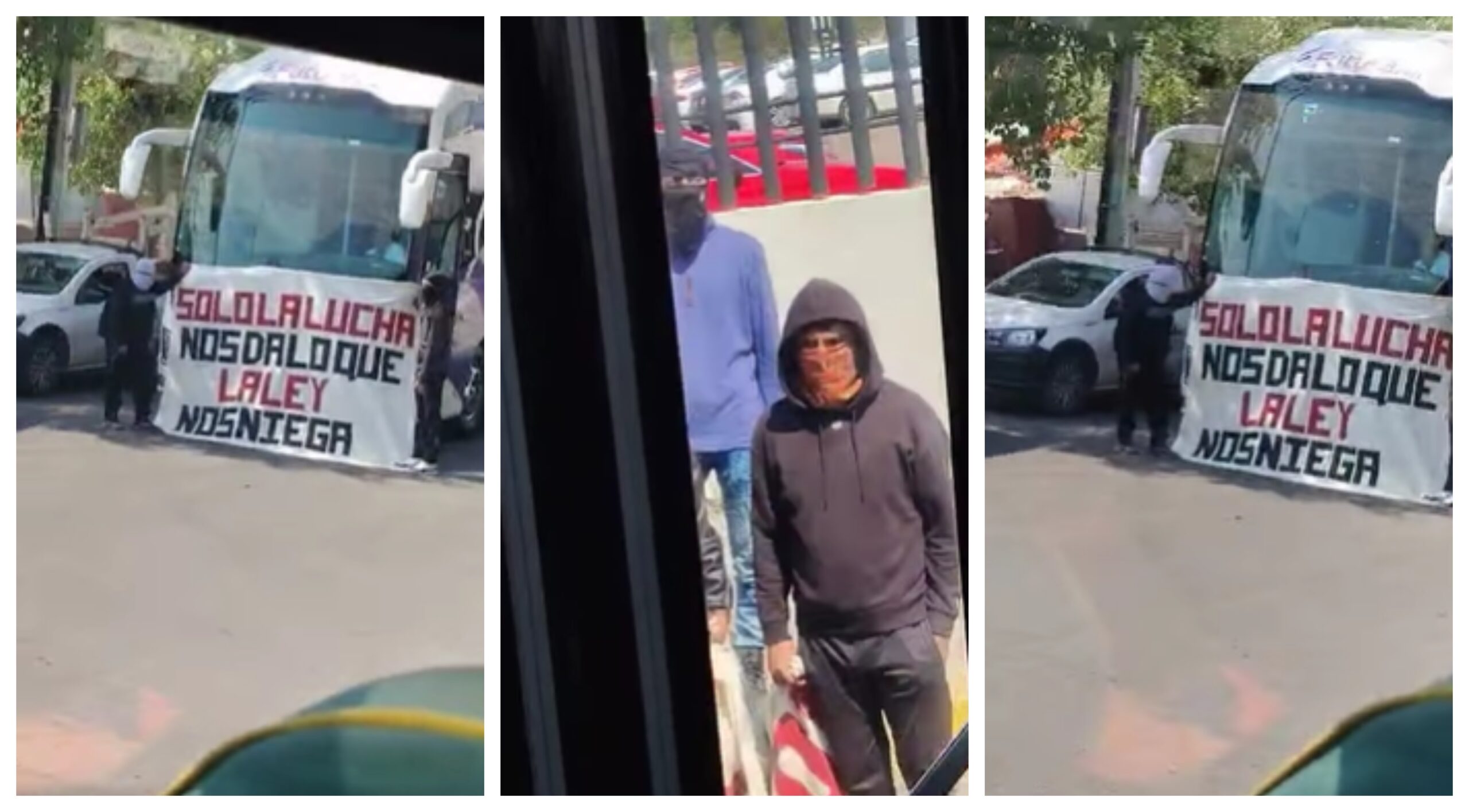 Un video que circula en redes sociales muestra a un autobús de la línea Futura con una lona de protesta de los manifestantes con la leyenda: “Solo la lucha nos da lo que la ley nos niega”.