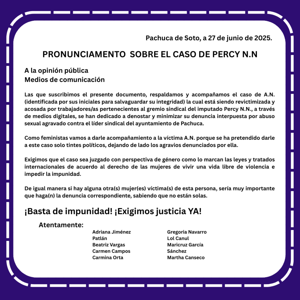 Un grupo de feministas denunció la revictimización y el acoso que enfrenta A.N., la mujer que acusó al líder sindical del ayuntamiento de Pachuca, Percy N.N., por abuso sexual agravado.