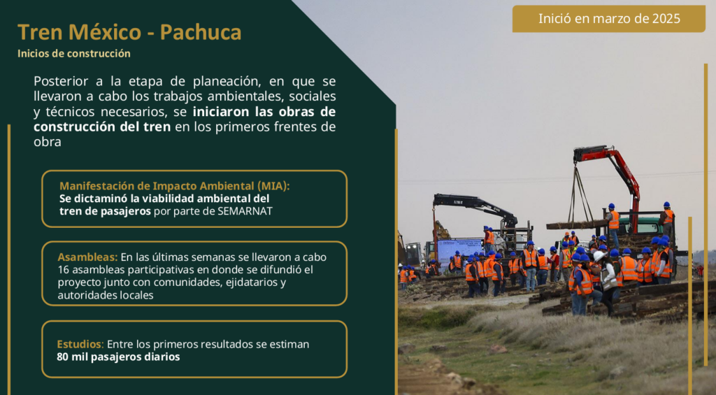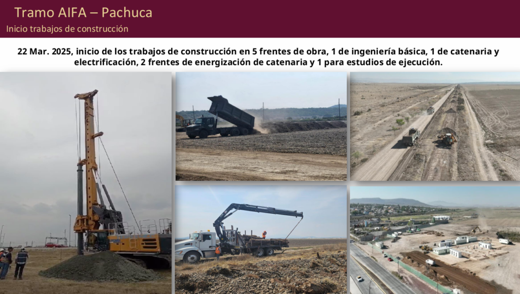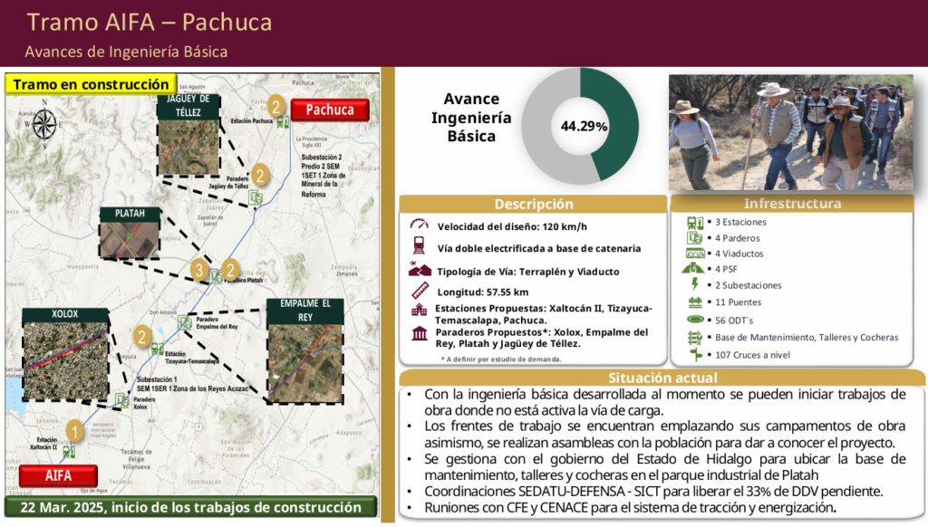 De igual manera, puntualizó que con la ingeniería básica desarrollada hasta el momento (44.29 por ciento de avance) se pueden iniciar trabajos de obra donde no está activa la vía de carga; asimismo, se gestiona con el gobierno del estado de Hidalgo un espacio para ubicar la base de mantenimiento, talleres y cocheras en el parque industrial Platah.