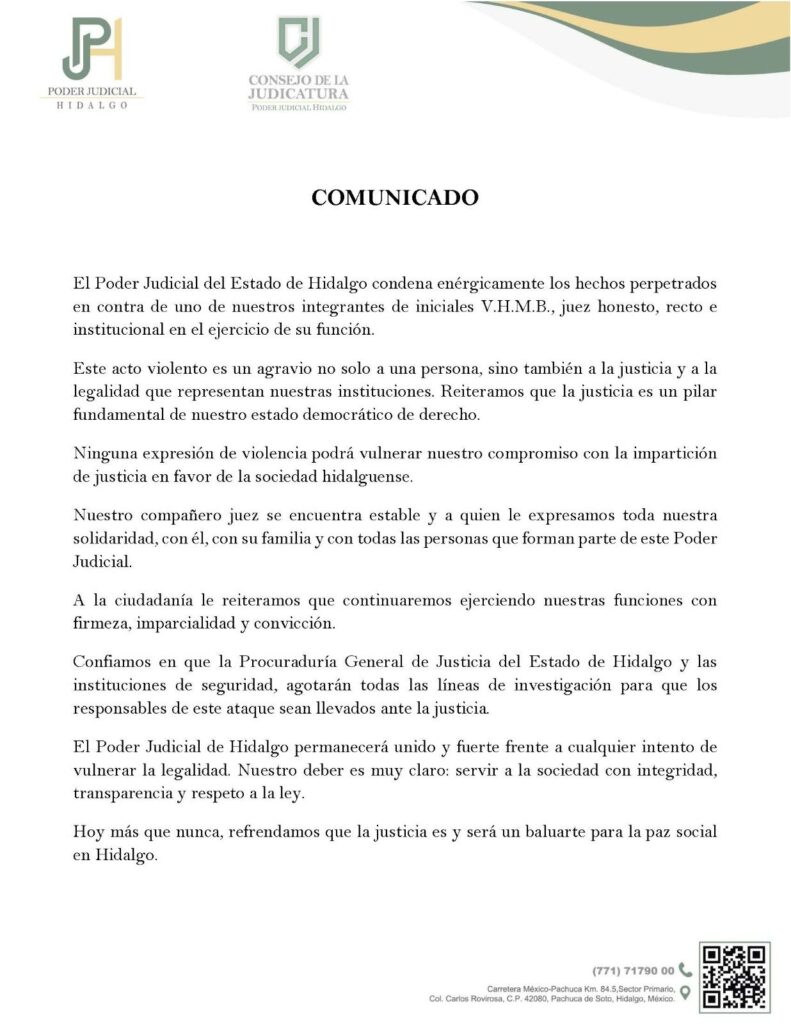 El Poder Judicial del Estado de Hidalgo condenó de manera enérgica el ataque violento en contra del juez V.H.M.B., quien se encuentra estable tras el atentado. La institución calificó este hecho como un agravio directo a la justicia, a la legalidad y al Estado de derecho.