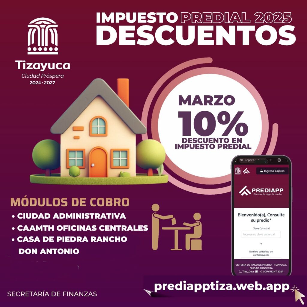 El próximo lunes 31 de marzo es el último día para que la población en general pueda beneficiarse con un 10% de descuento en el pago del impuesto predial en Tizayuca, así como un 50% de descuento para las personas jubiladas, pensionadas, de la tercera edad y con discapacidad.