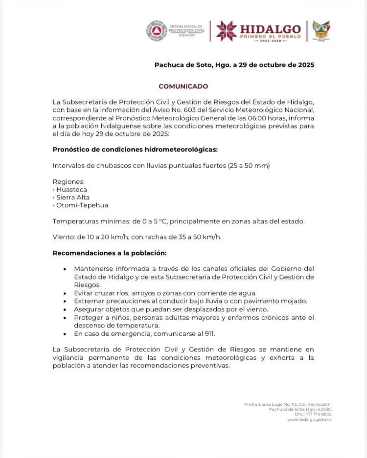 La Subsecretaría de Protección Civil y Gestión de Riesgos del Estado de Hidalgo informó sobre las condiciones meteorológicas que se esperan para este miércoles, de acuerdo con el Aviso No. 603 del Servicio Meteorológico Nacional.