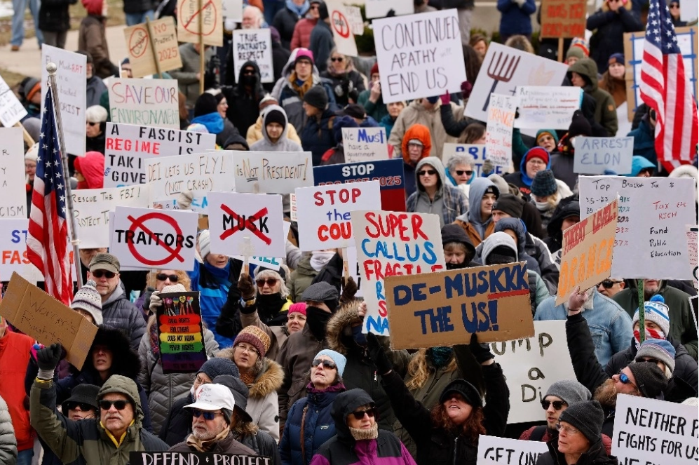 Los manifestantes exhibieron pancartas contra Trump; el multimillonario Elon Musk, líder del nuevo Departamento de Eficiencia Gubernamental de Trump; y el Proyecto 2025, un manual de la extrema derecha para el gobierno y la sociedad estadunidenses.