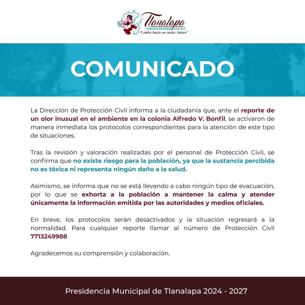 Antes de las 6:00 pm de este jueves, el ayuntamiento de Tlanalapa publicó un comunicado en sus redes sociales oficiales indicando que tras el olor inusual en la colonia Alfredo V. Bonfil, se activaron los protocolos corrrespondientes para ese tipo de situaciones.
