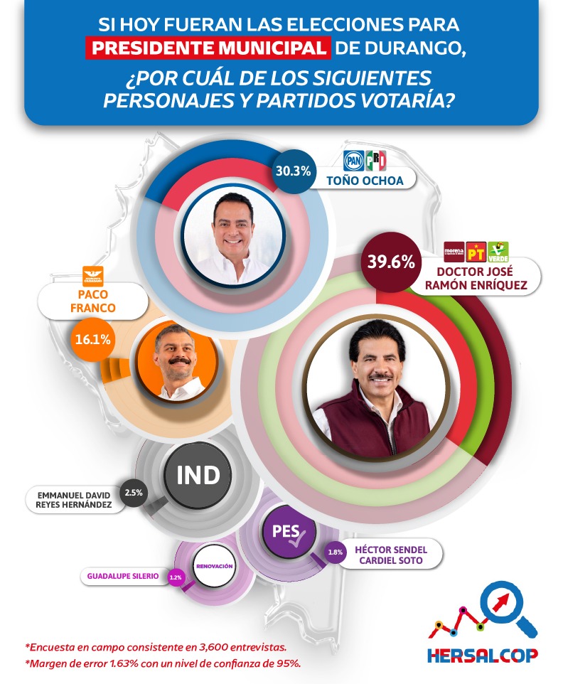 A prácticamente una semana de la jornada electoral para elegir al presidente municipal de Durango, el doctor José Ramón Enríquez Herrera, de la coalición Sigamos Haciendo Historia, lleva la delantera en la intención de voto con 39.6% de las preferencias.