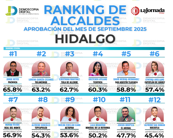 El mes de septiembre 2025 dejó nuevos resultados en el ranking de aprobación de alcaldes en Hidalgo, elaborado por Demoscopia Digital, que mide la percepción ciudadana sobre los presidentes municipales del estado.