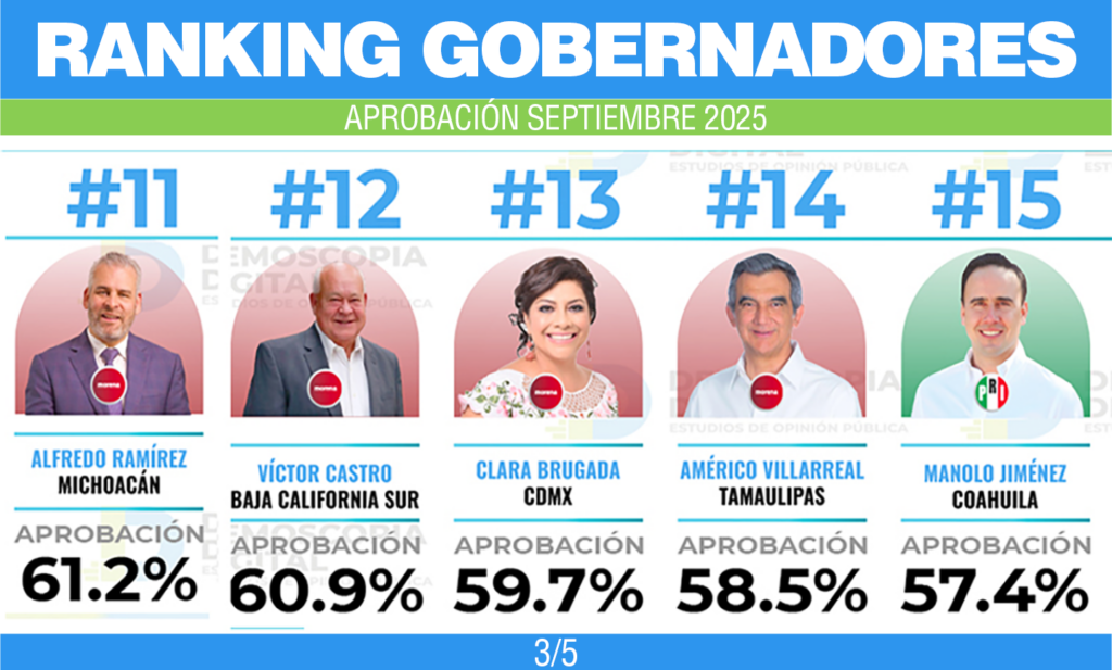 Cabe resaltar que, en comparación con agosto, cuando el gobernador encabezó este listado con 69.4 %, en septiembre registró una disminución de 0.7 puntos porcentuales, colocándose como el tercer mandatario con mayor nivel de aceptación.