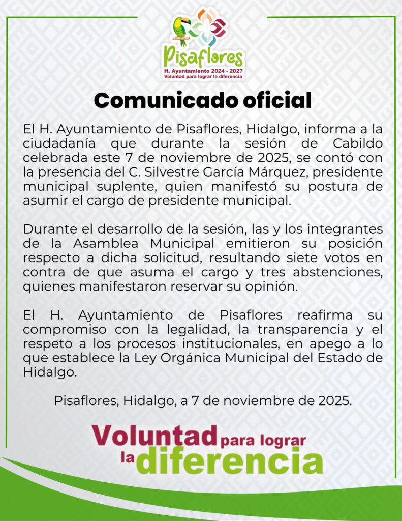 “El H. Ayuntamiento de Pisaflores reafirma su compromiso con la legalidad, la transparencia y el respeto a los procesos institucionales, en apego a lo que establece la Ley Orgánica Municipal del Estado de Hidalgo”, detalla el comunicado.