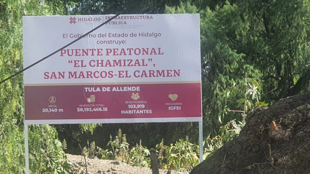 A través de un recurso estatal de 8 millones 193 mil 466 pesos, el gobierno de Hidalgo trabaja en Tula de Allende para reponer el puente peatonal de El Chamizal, que conecta las comunidades de San Marcos y El Carmen, esto luego de que el puente fue arrastrado por la corriente que inundó Tula en septiembre del 2021.