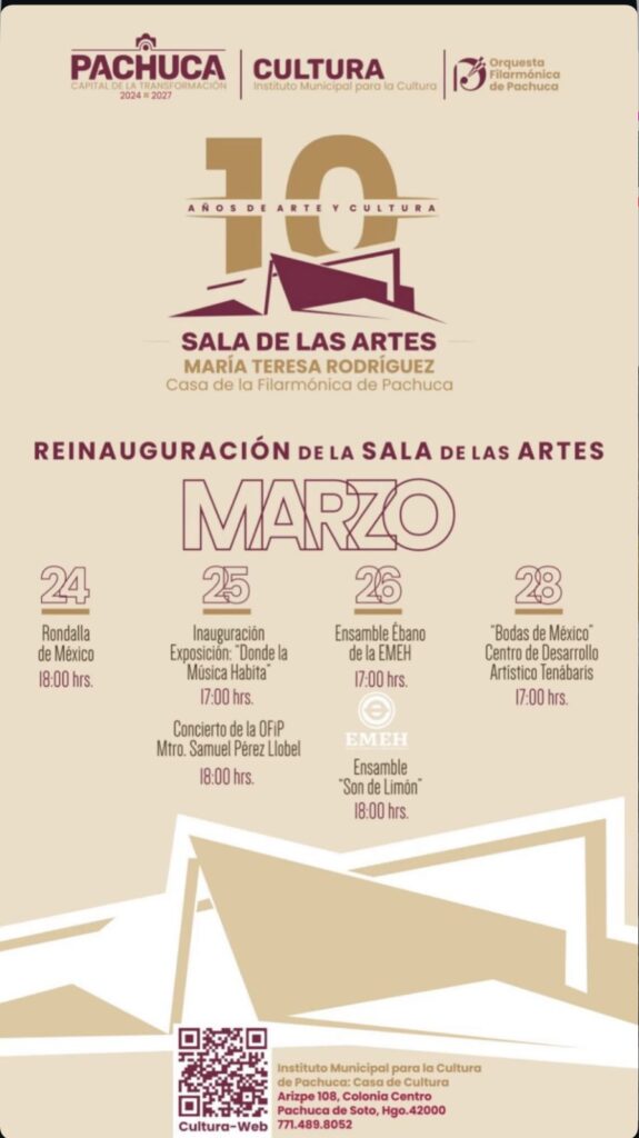 La reinauguración del recinto se realizará el 25 de marzo a las 17:00 horas con una exposición llamada “Donde la música habita”, que mostrará la historia del espacio y su vínculo con la Orquesta Filarmónica de Pachuca, agrupación que ha tenido en este lugar una de sus sedes durante los últimos años.