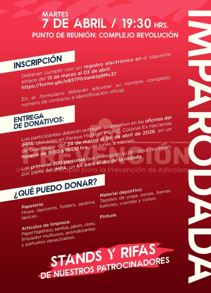 Para formar parte de esta rodada, los organizadores solicitan a los participantes llevar un donativo en especie, específicamente artículos de oficina, los cuales serán destinados a programas de prevención.