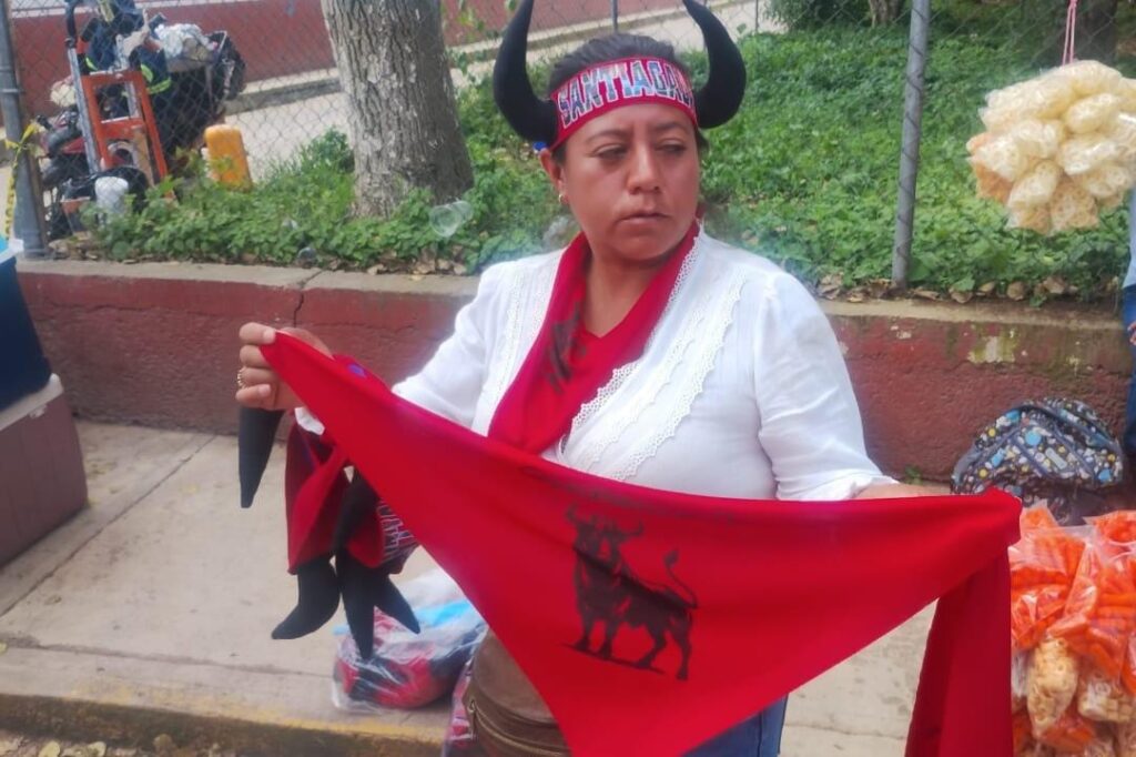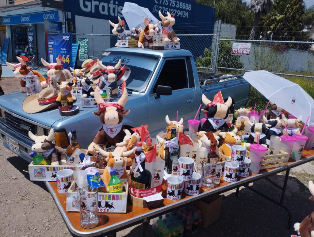 Al mismo tiempo, el corredor se llenó de venta ambulante: desde osos de peluche con motivos taurinos, hasta el tradicional pulque, micheladas, cantaritos, shots de caña y, por supuesto, la renta de baños. Incluso, sobre la carretera a la altura de Medias Tierras, no faltaba el souvenir de la Santiagada.