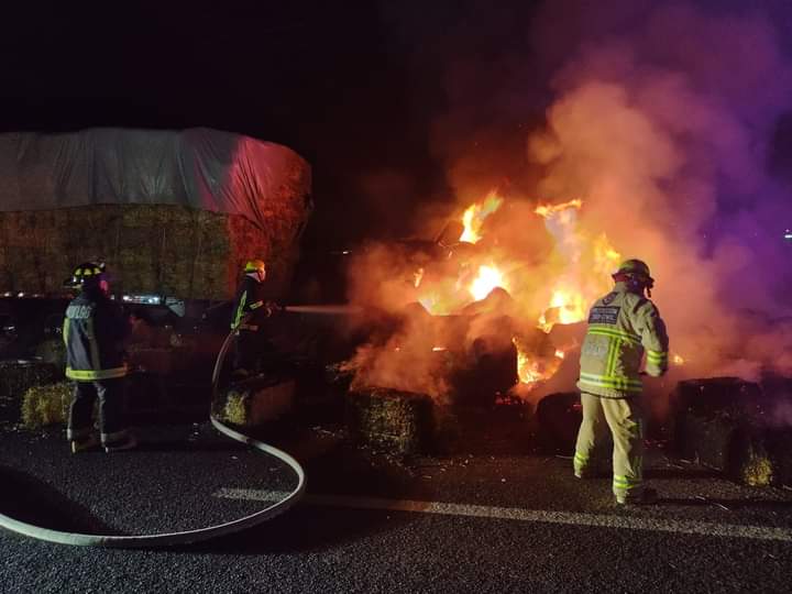 Este martes en la madrugada, un remolque de pacas se incendió en la carretera Pachuca-Actopan, justo por el entronque a San Agustín Tlaxiaca.