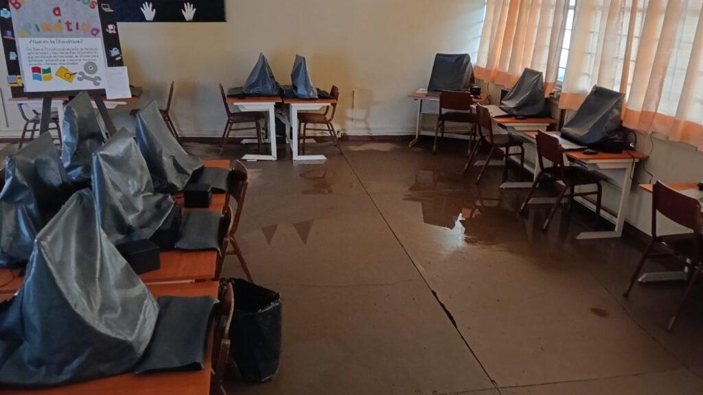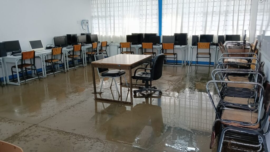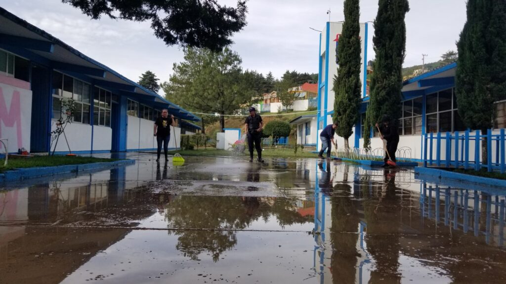 El martes, autoridades municipales acudieron al plantel para supervisar los daños ocasionados por las lluvias, mismas que también generaron complicaciones en otros puntos del municipio. Fotografías compartidas en redes sociales mostraron aulas anegadas y pasillos con acumulación de agua.