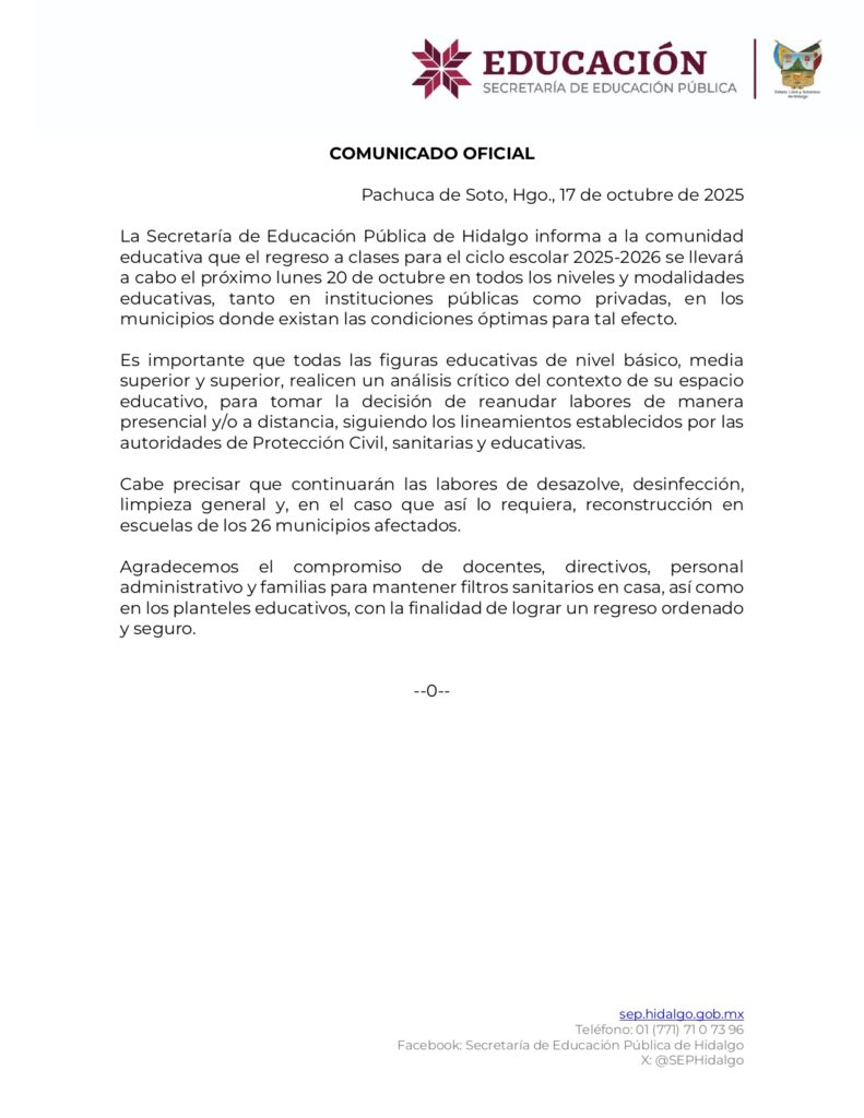 La Secretaría de Educación Pública de Hidalgo (SEPH) confirmó que el regreso a clases para el ciclo escolar 2025-2026 se llevará a cabo el próximo lunes 20 de octubre. La medida se aplicará a todos los niveles y modalidades educativas en instituciones públicas y privadas, siempre y cuando las condiciones sean óptimas en los municipios correspondientes.