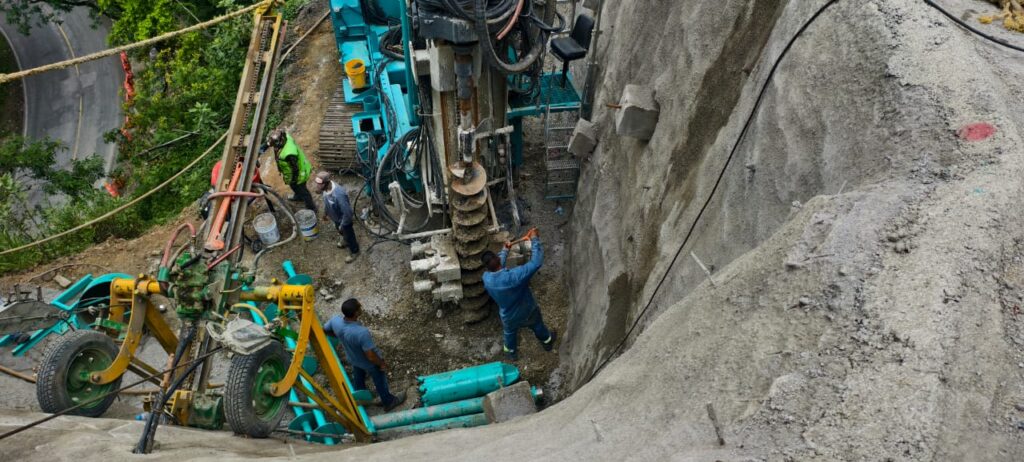 En el kilómetro 177+000, personal especializado realiza intervenciones físicas para estabilizar una falla geológica, utilizando maquinaria y técnicas de seguridad que garanticen la operación segura de la vía.
