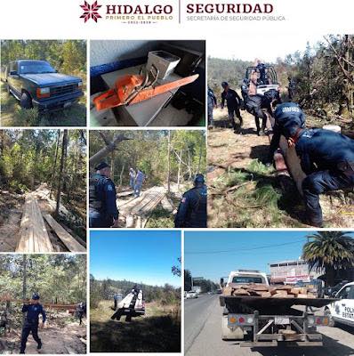 La Secretaría de Seguridad Pública de Hidalgo (SSPH) incautó herramientas utilizadas para la tala, tres árboles, 31 tablones de diferentes medidas, 12 barrotes de madera, 24 vigas, 12 cintas, 10 costeras y seis troncos.