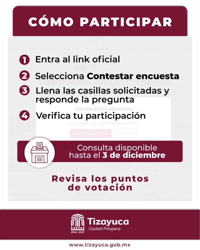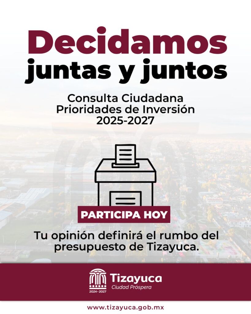 El municipio de Tizayuca inició un ejercicio de participación directa mediante la consulta “Decidamos juntas y juntos”, en la cual la población podrá decidir si una parte del presupuesto municipal se redirige hacia obras de infraestructura vial en lugar de actividades recreativas.