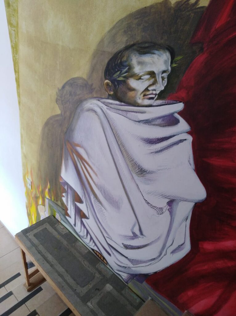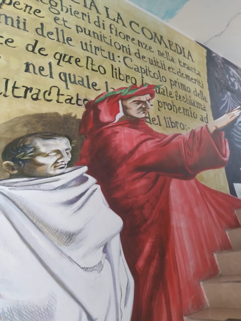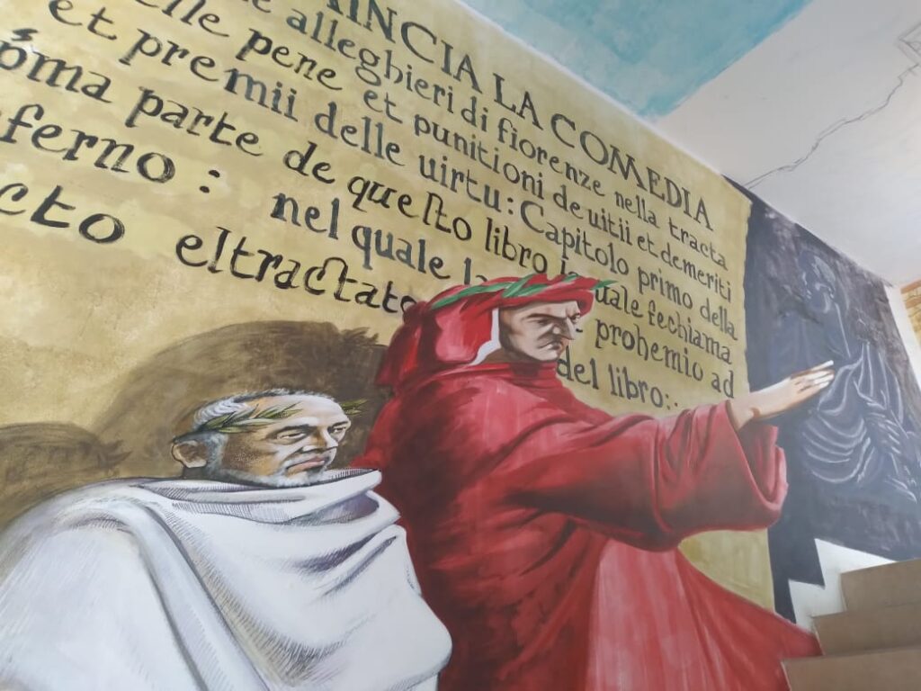 El mural, ubicado en las escaleras del recinto, mostraba la fisonomía de un hombre con gran parecido al funcionario, junto a la figura del poeta y político italiano Dante Alighieri, con su poema épico La Divina Comedia.