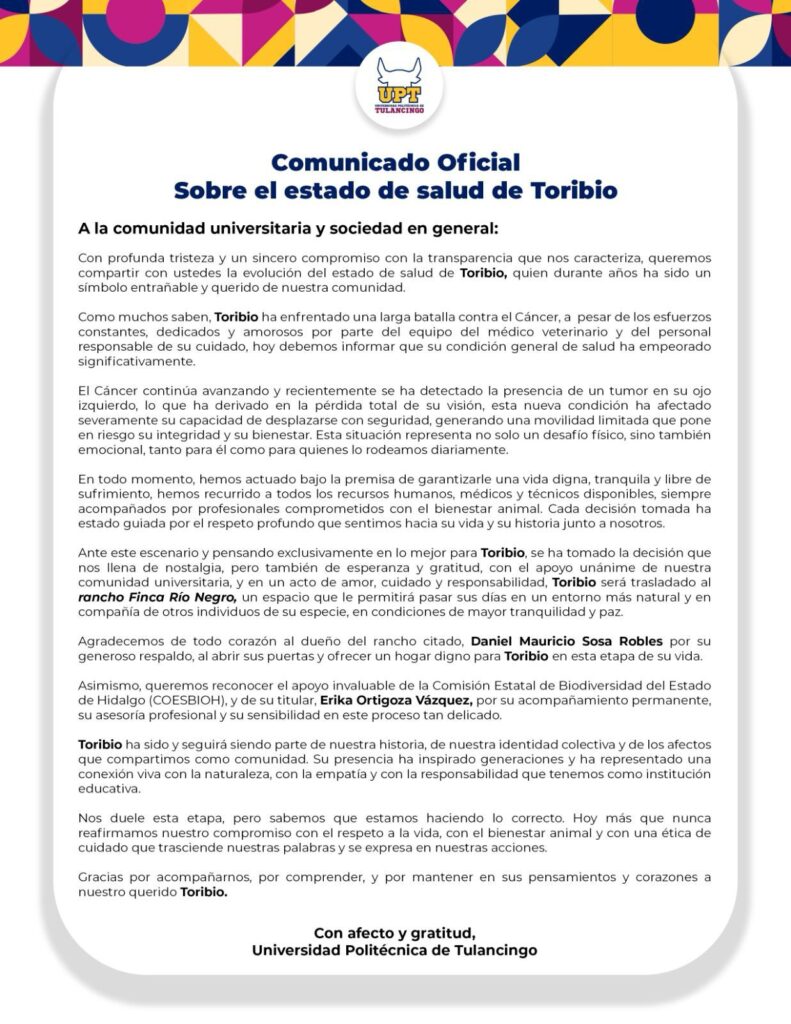 La Universidad Politécnica de Tulancingo (UPT) anunció que su toro mascota, Toribio, será trasladado al rancho Finca Río Negro para pasar sus últimos días, tras ser diagnosticado con cáncer. La decisión fue tomada en consenso con directivos, jefes de grupo y coordinadores, según informó el rector Felipe Olimpo Durán Rocha.