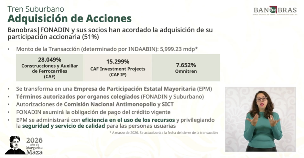 Con esta operación, la administración quedará a cargo del Fondo Nacional de Infraestructura (Fonadin), organismo que también opera el Tren Interurbano México–Toluca y que gestionará los futuros proyectos hacia Querétaro y Pachuca.